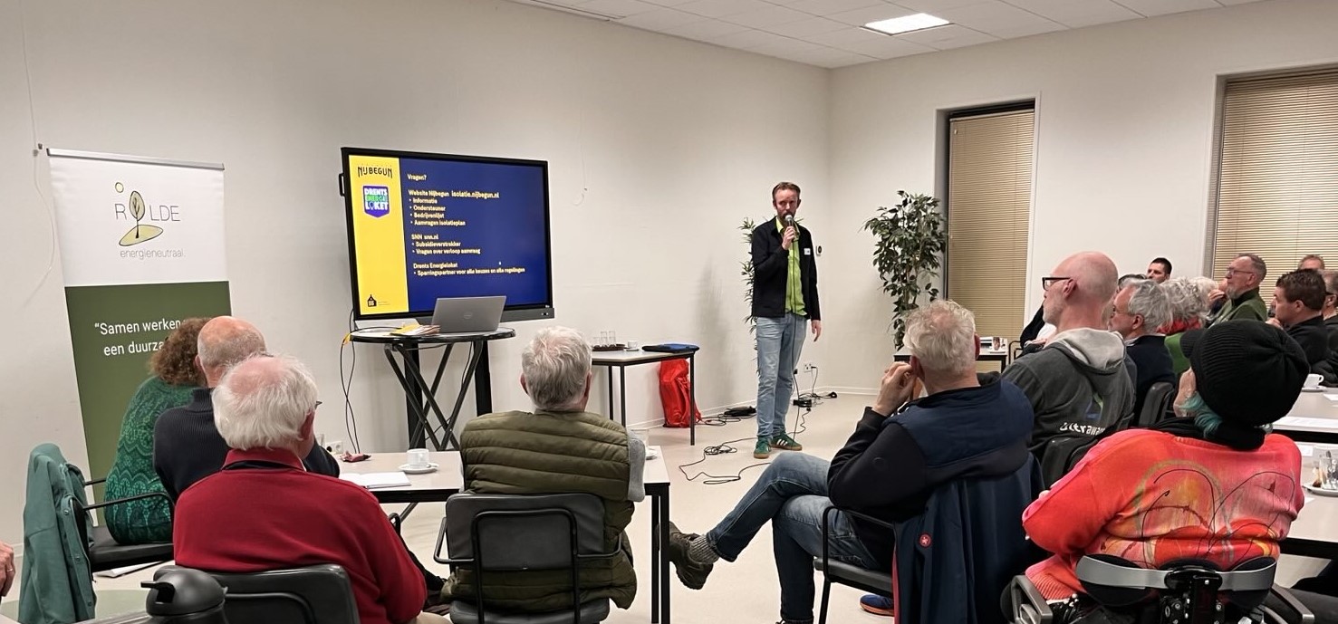 Jelte vertelde ook over de subsidieregeling voor isolatie maatregelen van Nij Begun. Deze regeling gaat de komende 30 jaar lopen. Het streven is om alle woningen in Groningen en Noord Drenthe goed geïsoleerd te krijgen. Het is een gunstige regeling. Je kunt vaak 50% van de kosten voor isolatie maatregelen vergoed krijgen. Zorg wel dat je goed weet wat de voorwaarden zijn. Zo moet je bijvoorbeeld gebruik maken van bedrijven die op de lijst van Nij Begun staan. Er is ook, voor het eerst, een vergoeding voor doe-het-zelfvers. Je kunt soms ook gebruik maken van een gratis adviseur van Nij Begun. Meer informatie is te vinden op de websites van Nij Begun of SNN of via het Drents Energieloket. Ook de energie coaches kunnen je op weg helpen met bijvoorbeeld een warmtescan van je huis, zodat je kunt zien waar isoleren nodig is. Te vinden via de site van de gemeente: energiecoach Aa en Hunze. Tenslotte werd verteld over Energie van Ons, een energieleverancier van de drie noordelijke provincies, die lokaal opgewekte energie aanbiedt. Deze energie komt van 150 lokale energie coöperaties, die zonne- en windenergie opwekken. Meer informatie op energie.vanons.org. Rolde Energieneutraal is ook zo’n lokale energiecoöperatie. Zij zijn druk bezig met het zoeken naar een geschikt dak voor een zonne-energieproject. Na afloop gaf een aantal mensen die wij spraken aan, dat zij de informatie nuttig vonden. Een geslaagde bijeenkomst dus.